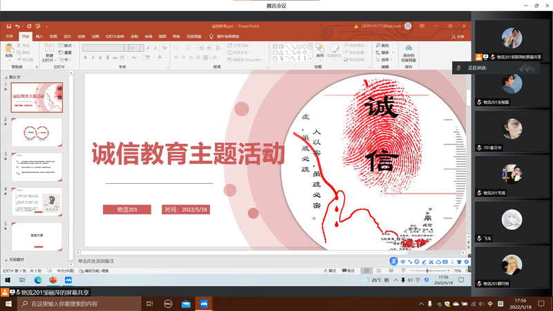 5月18日下午,物流201班通过线上会议的方式组织召开了诚信主题教育活动,会议由生活委员邹丽萍主持,全体学生参加。