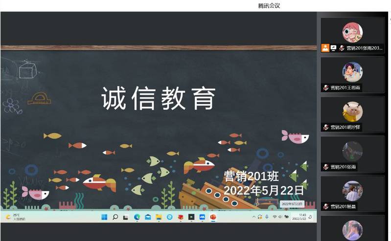 5月22日下午,营销201班全体同学在线上举行了以“诚信教育”为主题的班会。希望通过此次活动,切实提升学生的诚信品质、自律意识和社会责任感。
