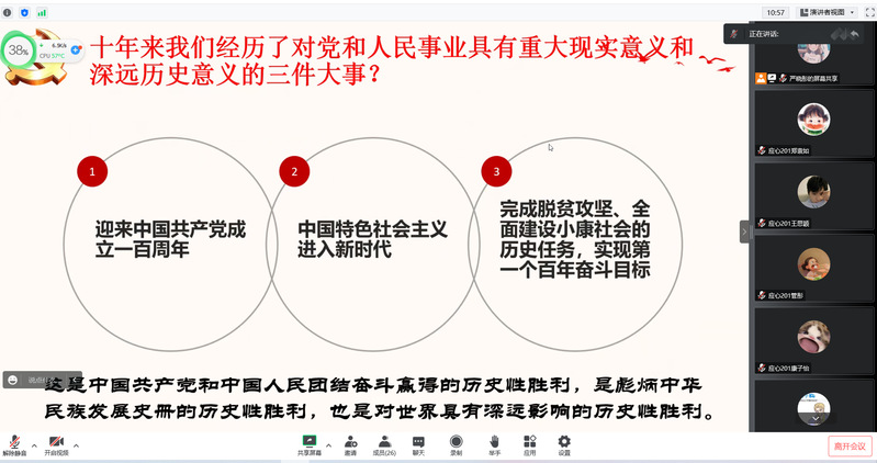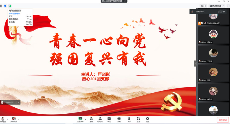 11月4日晚,理学与经管学部应心201班于腾讯会议召开“青春一心向党,强国复兴有我”组织生活会。本次会议由应心201班团支书严晓彤同学主持进行,该班全体团员出席了本次会议。