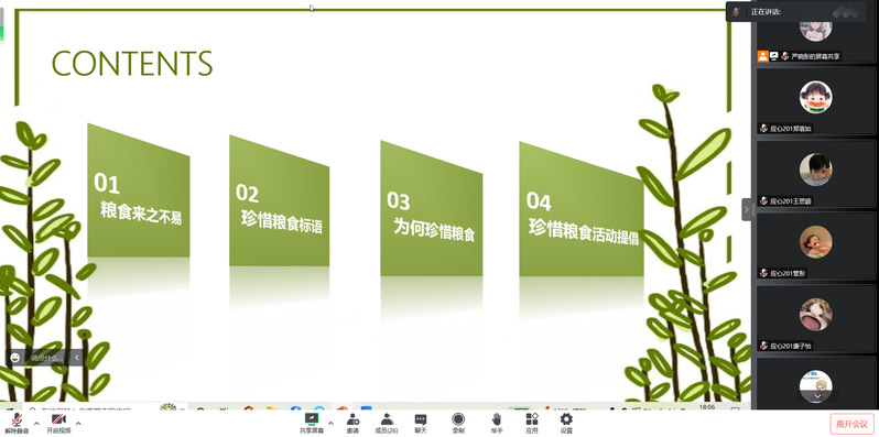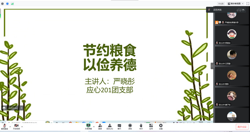 11月4日晚,我院理学与经管学部应用心理学201班于腾讯会议组织“节约粮食,简以养德”主题团日活动。本次会议由应心201班团支书严晓彤同学主持进行,该班全体团员出席了本次活动。