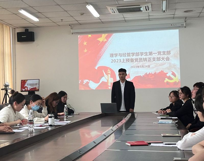 5月24日,理学与经管学部学生第一党支部在启东校区综合楼A201会议室召开2023年上半年预备党员转正支部大会,会议由党支部书记罗晶晶同志主持,支部全体党员出席会议。