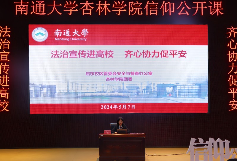 5月7日下午,管委会安全与督查办公室与学院团委共同举办主题为“法治宣传进高校 齐心协力促平安”的信仰公开课宣传讲座,活动特请启东市人民法院高新区人民法庭副庭长顾佳庆作专题主讲人。