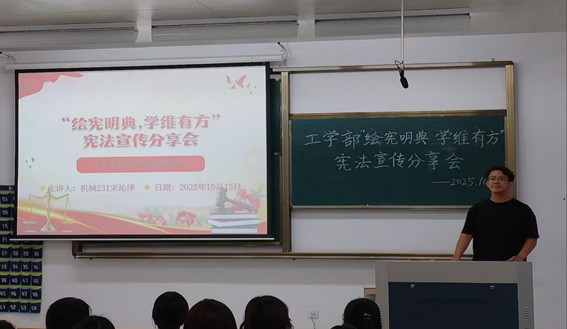 为深入学习贯彻习近平法治思想,增强学生法治素养与维权能力,推动宪法精神进校园,10月15日下午16:30,工学部于JX1-2-117举办“绘宪明典,学维有方”宪法宣传分享会。本次分享会以“聚焦民法典中的维权智慧”为主题,由工学部辅导员朱加鹏主持,机械231班宋沁泽主讲,工学部2025级辅导员黄晓敏出席会议。
