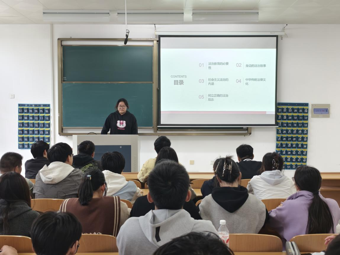 班会上,惠知雅结合大学生实际生活,阐述了法治教育在个人成长与发展中的重要意义,强调法律素养是当代大学生不可或缺的基本素质。她系统解读了社会主义法治的核心内涵,引导同学们树立正确的法治观念。在“讲讲身边的法治故事”环节,惠知雅通过生动真实的案例分享,使同学们深切感受到法律与日常生活的密切联系。团支书杜宇凡带领大家回顾中华传统法律文化,汲取其中智慧精华,并组织同学们围绕“如何树立正确的法治观念”展开深入讨论。他倡议大家将法治精神内化于心、外化于行,自觉做社会主义法治的忠实崇尚者、自觉遵守者和坚定捍卫者。