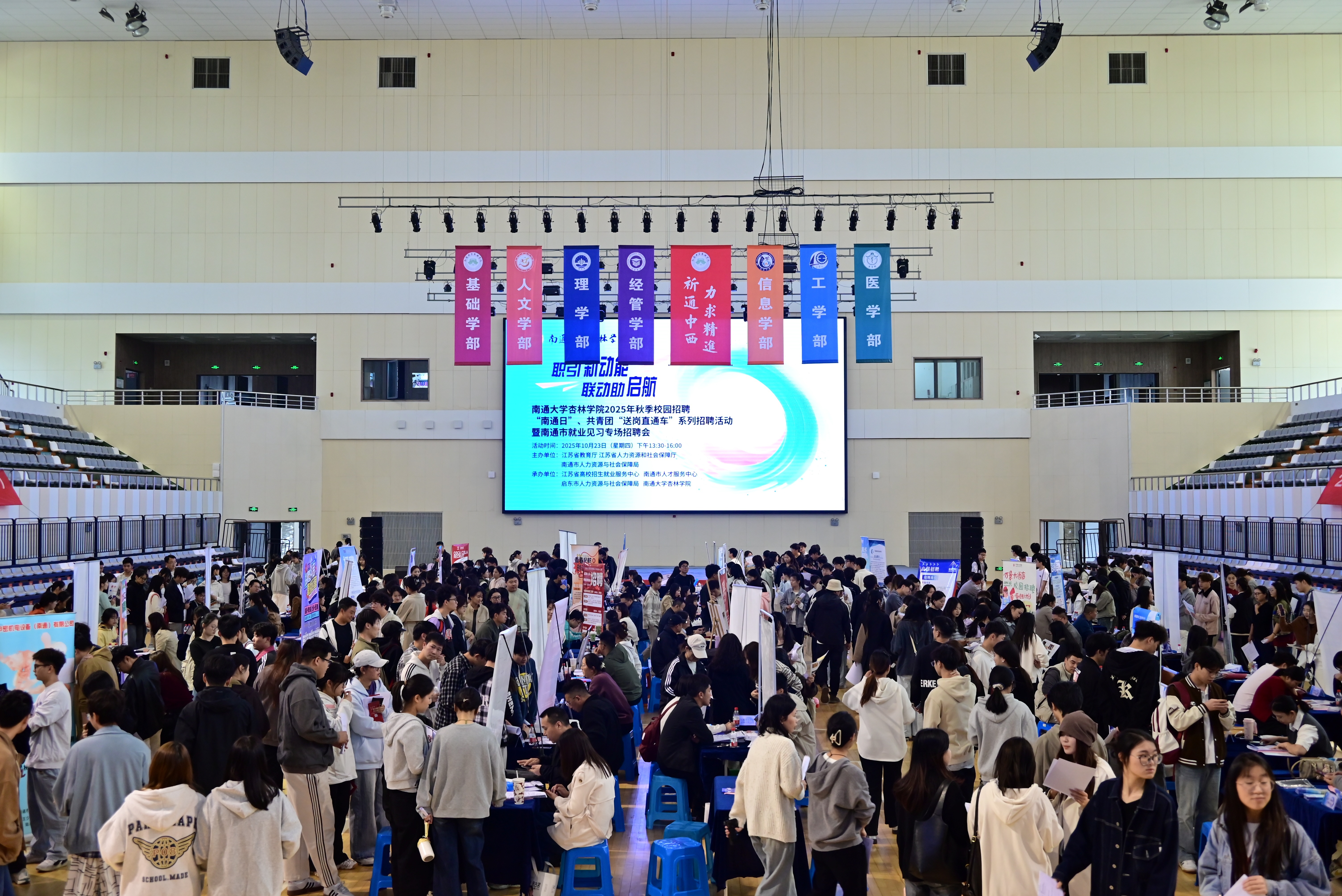 10月23日下午,我院在启东校区体育馆成功举办“职引新动能 联动助启航”南通大学杏林学院2025年秋季校园招聘“南通日”、共青团“送岗直通车”系列招聘活动暨南通市就业见习专场招聘会。
