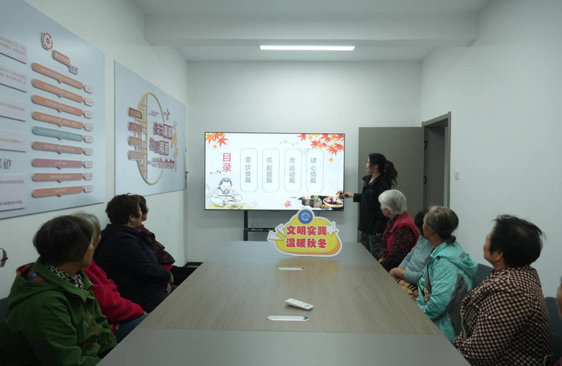 互动提问环节,老人们纷纷踊跃举手,提出了自己在日常生活中遇到的各种养生疑问。有的老人询问“秋季是否适合进补”“血压高人群如何调整饮食”等问题。志愿者孙雨洁结合中医理论与日常护理知识逐一解答,引用中医“虚者补之”的原则,强调:“进补阴虚、阳虚、气虚、血虚不同体质,需因人而异,根据个人体质进行合理调整。血压高的人群,饮食上应遵循低盐、低脂、低糖的原则。同时,要注意饮食的均衡和规律,避免暴饮暴食。”孙雨洁同学的精准解答既化解了老人们的养生困惑,也让中医知识变得更易理解、更接地气。