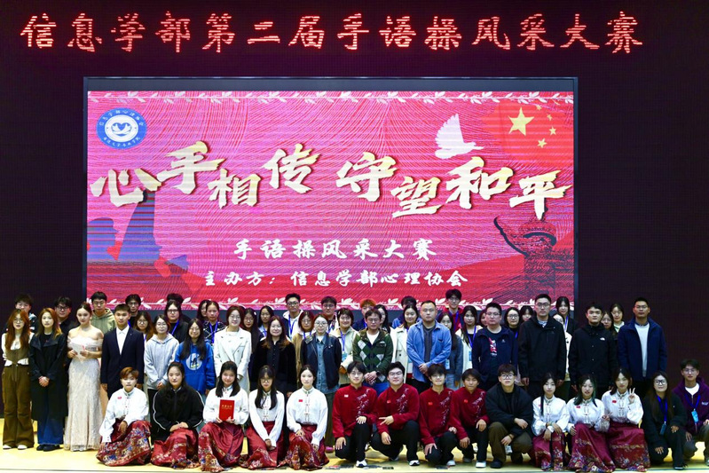 活动尾声,主持人总结,希望同学们带着“心手相传”的默契和“守望和平”的初心,让青春与和平同行,让信念坚定绵长。此次手语操大赛是信息学部心理协会将红色教育与校园文化结合的创新尝试,纪念抗战胜利80周年,传承革命精神,增强学生社会责任感与集体凝聚力,让“和平、奉献、团结”的理念融入校园生活。