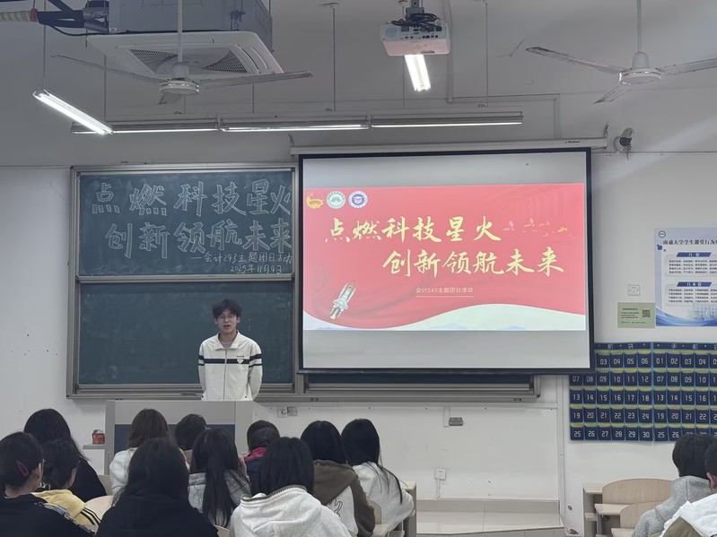 为激发班级同学们的科技创新意识,培养创新思维。 会计243班于11月4日在JX3-4-102开展了以“点燃科技星火,创新领航未来”为主题的团日活动,本次活动由团支书王晖担任主讲人,会计243班全体同学参加。