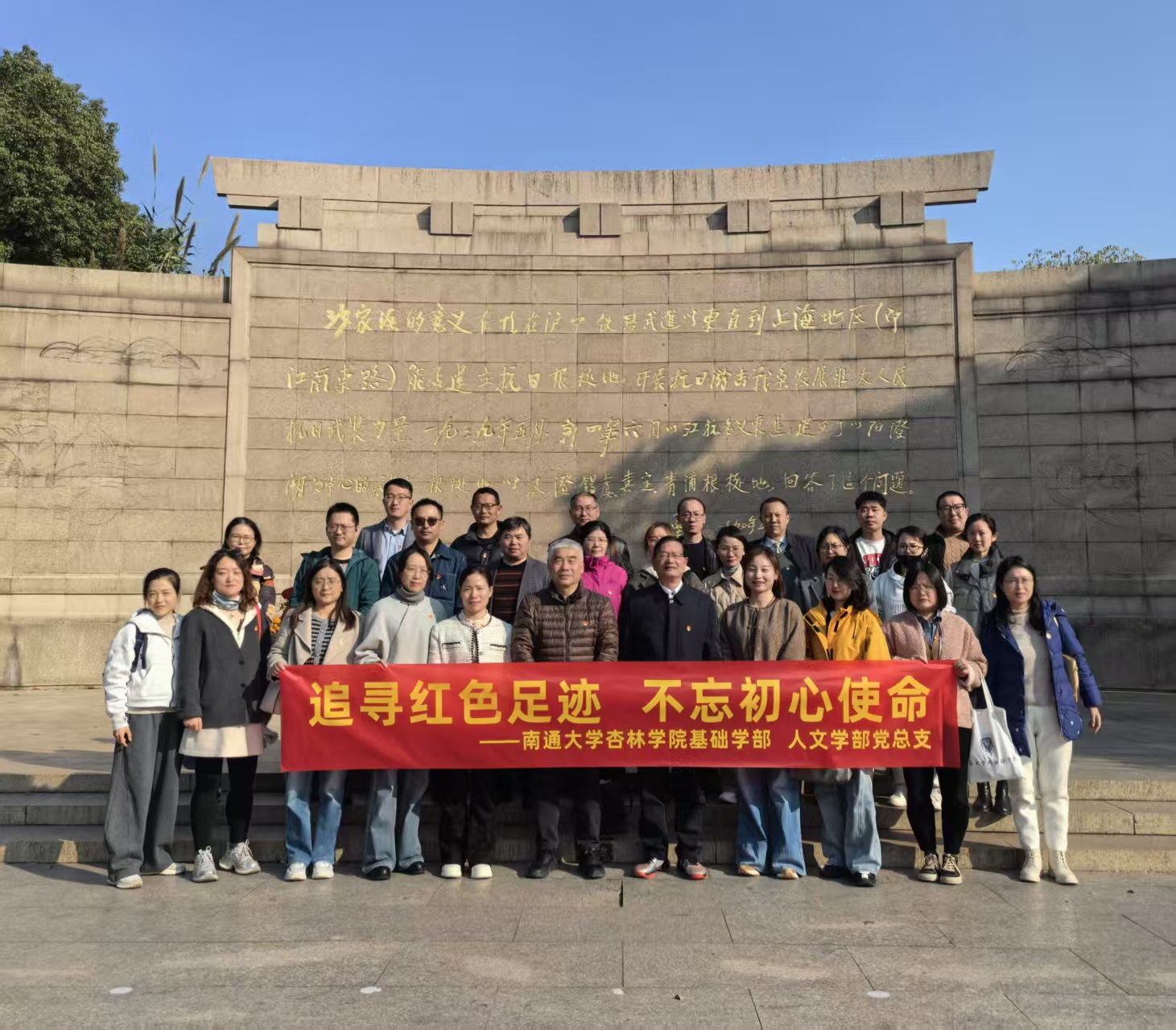 为深入学习贯彻习近平新时代中国特色社会主义思想,弘扬革命文化,锤炼党员党性修养,2025年11月22日,人文学部和基础学部党总支教工党员赴全国爱国主义教育示范基地——沙家浜革命历史纪念馆,开展“追寻红色足迹不忘初心使命”主题党日活动,共同接受红色教育,追寻红色足迹。
