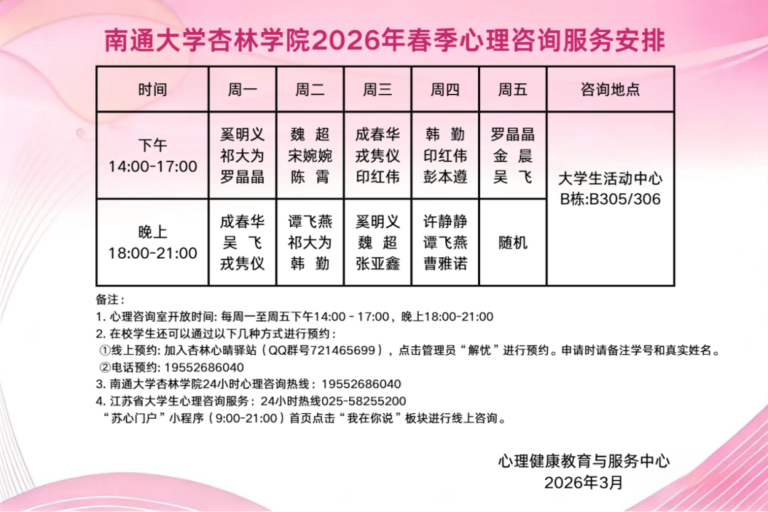南通大学杏林学院2026年春季心理咨询服务安排