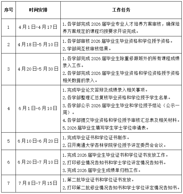 2026届毕业生毕业资格和学位授予资格具体工作任务及时间初步安排如下