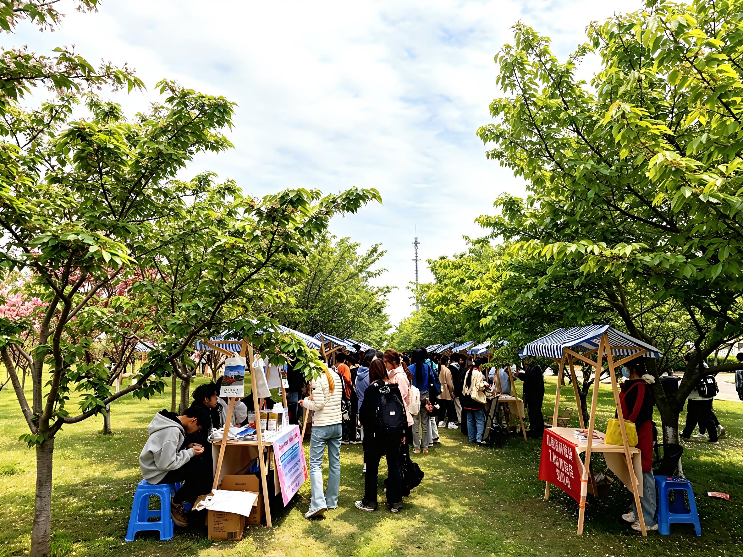 繁花似锦处,烟火正盎然。活动现场,粉白樱花与错落排布的市集摊位相映成趣,构筑出一道青春靓丽的校园风景线。师生们踊跃驻足,在琳琅满目的手工制品、创意摆件与特色饮品中穿梭选购,于光影流转间共赏樱花盛景,共享创意活力。