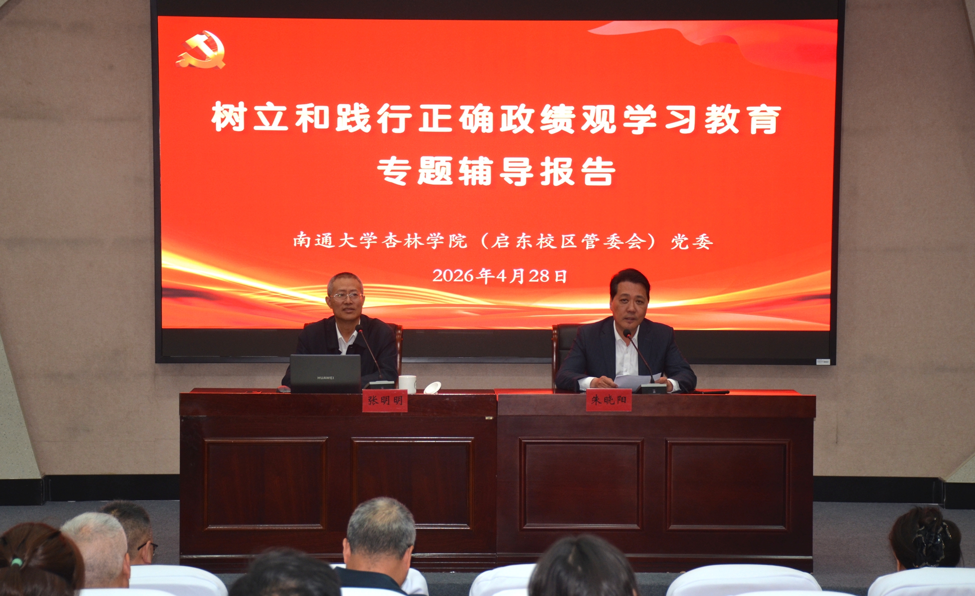 4月28日上午,我院邀请新华日报“新华红”党建创新研究院首席研究员、南京师范大学党建研究中心主任、南通理工学院马克思主义学院院长张明明做树立和践行正确政绩观学习教育专题辅导报告,学院(管委会)党委书记、启东校区管委会常务副主任朱晓阳主持报告会。